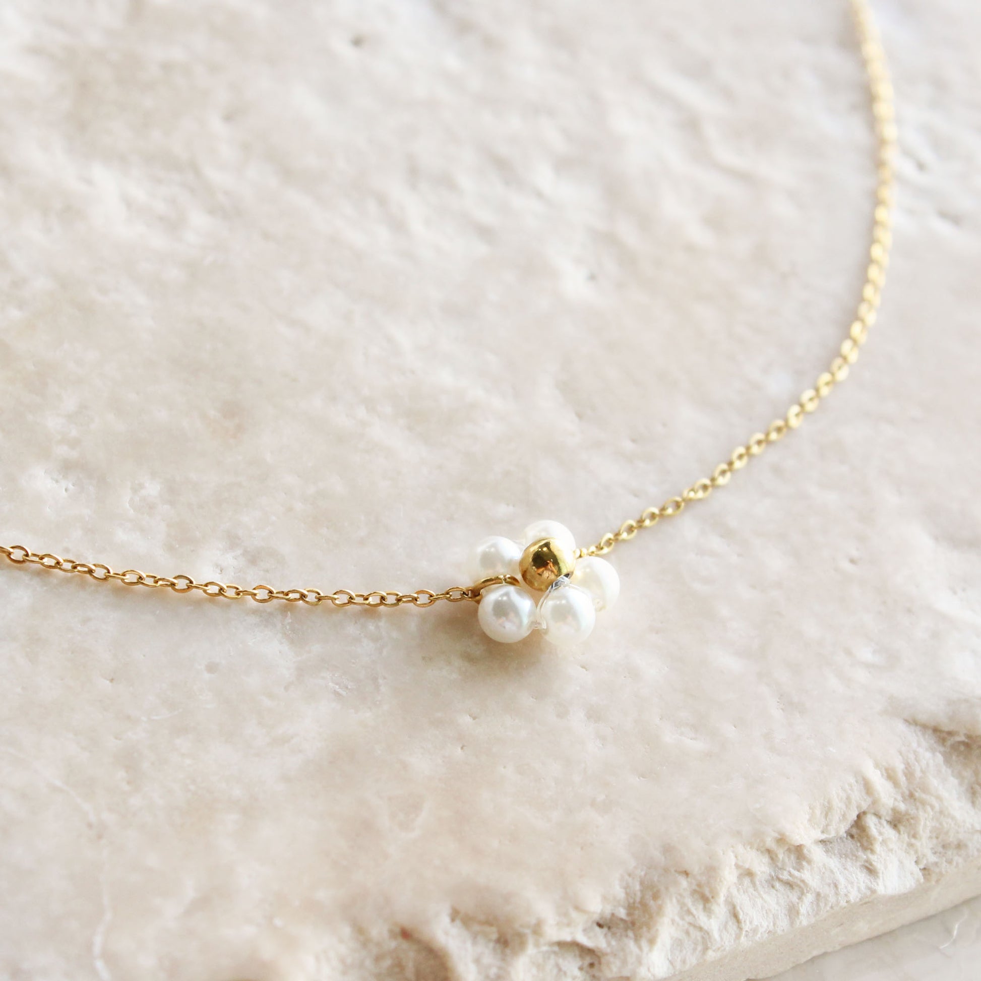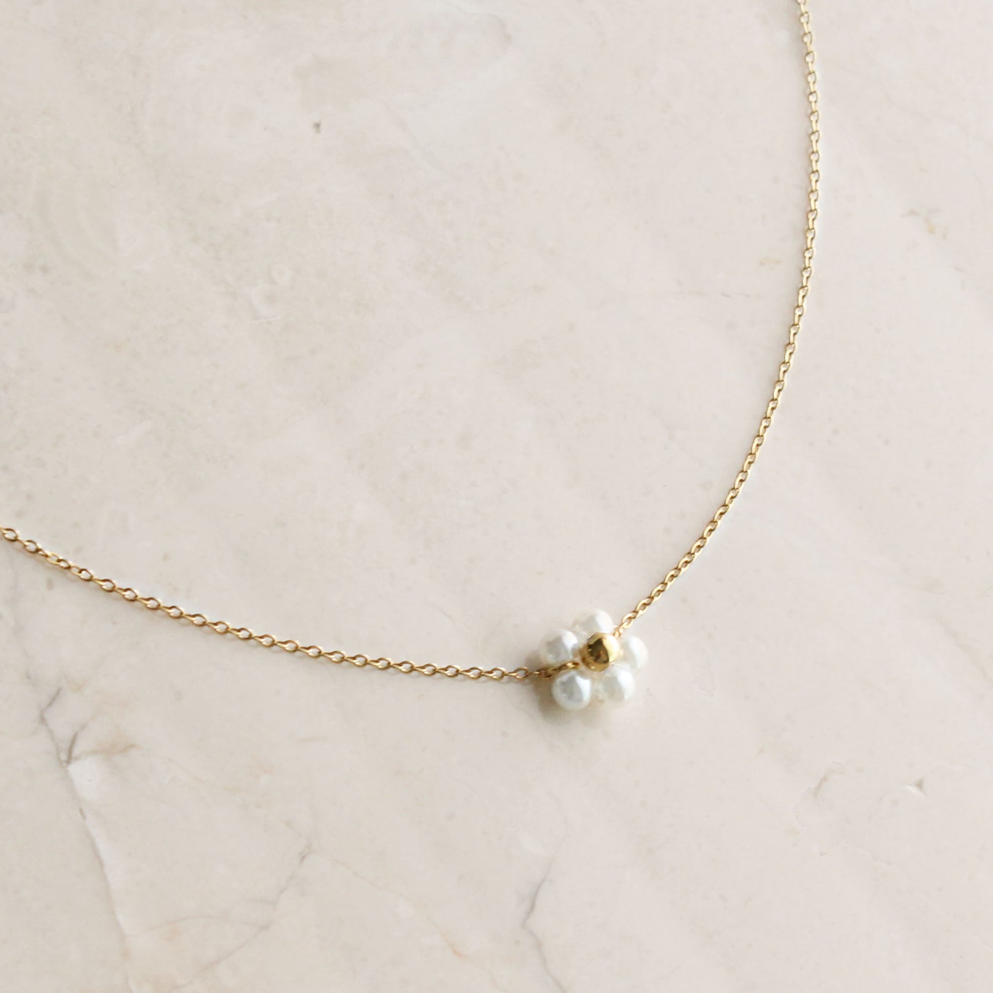 - Featuring a Daisy Pearl Necklace, dainty and simple